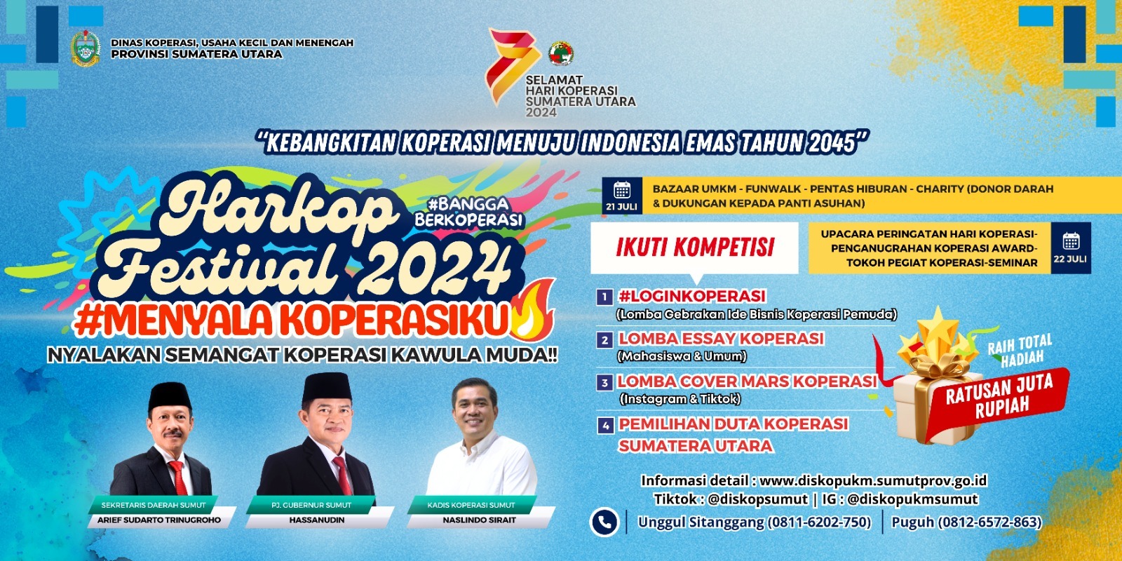 dailyklik, Medan - Dalam rangka memperingati Hari Koperasi Nasional yang ke-77, Dinas Koperasi dan UKM Provinsi Sumatera Utara dengan bangga mempersembahkan Harkop Festival 2024. Festival yang akan digelar pada tanggal 21-22 Juli 2024 di PRSU dan Aula RIS Kantor Gubernur Sumatera Utara ini mengusung tema besar “Kebangkitan Koperasi Menuju Indonesia Emas Tahun 2045.”