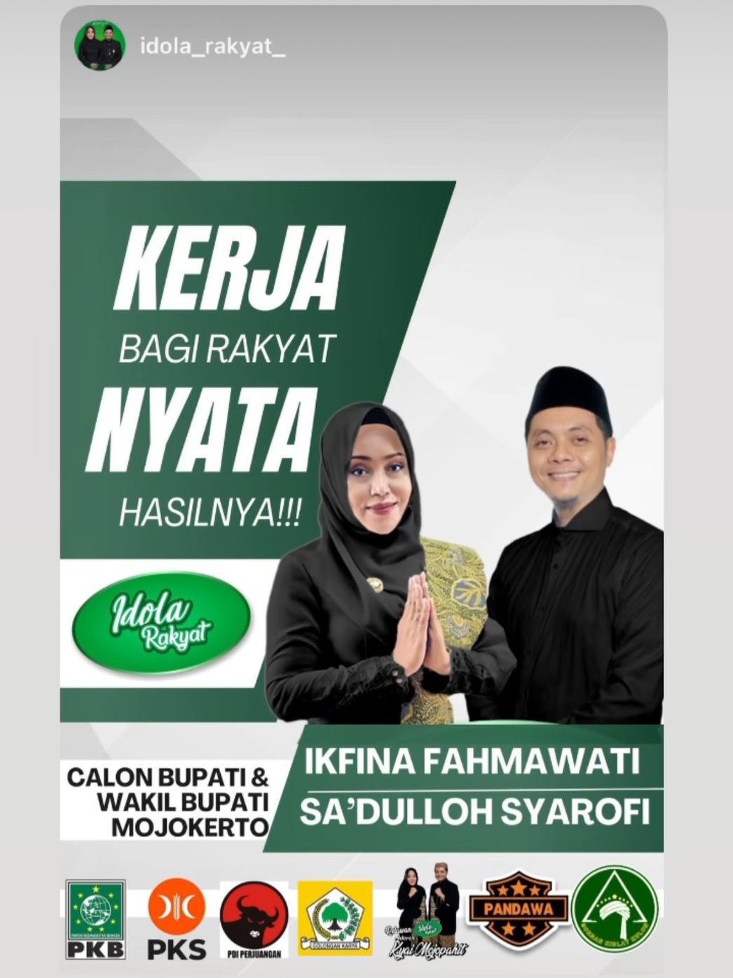 Unggahan poster yang turut dilihat dailyklik, Rabu (14/08), Ikfina menampilkan dirinya bersama Sa'dulloh Syarofi, yang akan mendampinginya sebagai calon Wakil Bupati Mojokerto. Dalam poster tersebut, keduanya tampil dengan nuansa hijau yang dominan, memperkuat citra mereka sebagai pasangan yang didukung oleh PKB dan PKS.