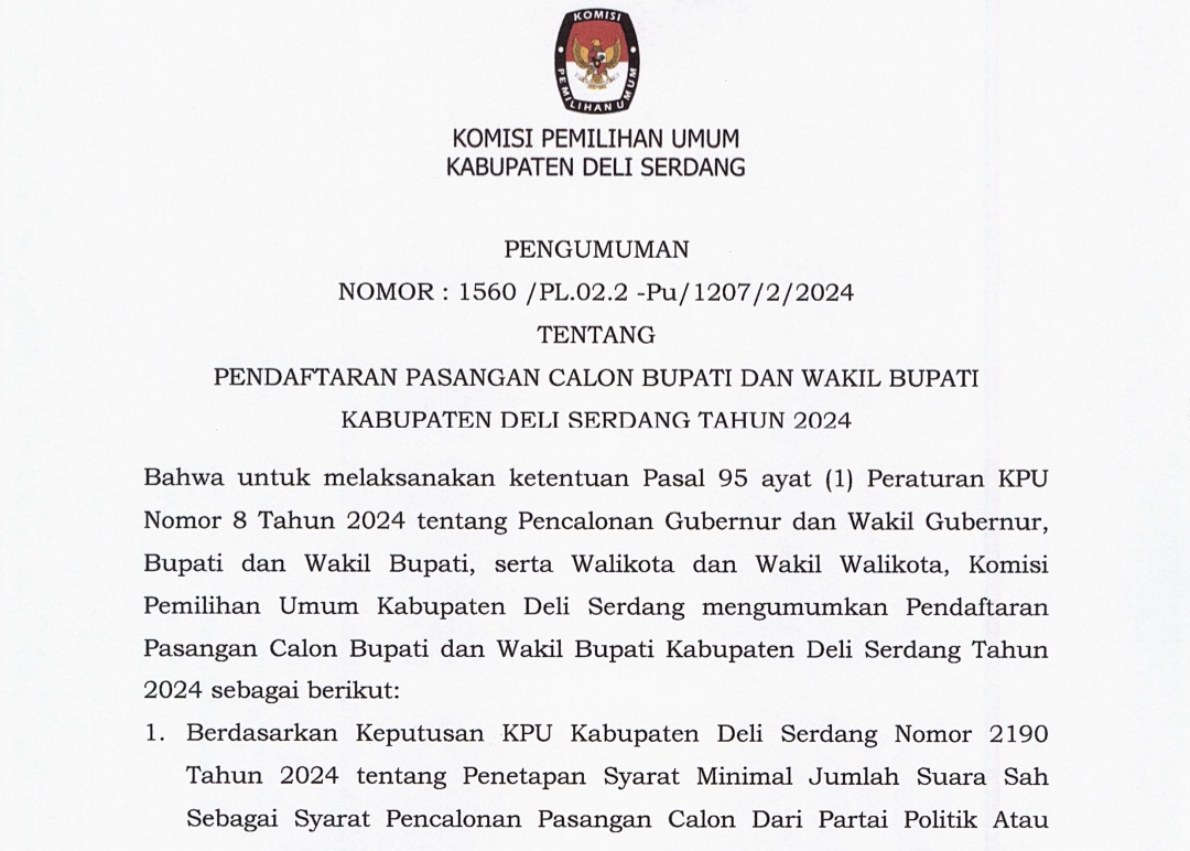 Yang mana pada poin pertama tercantum, berdasarkan Keputusan KPU Kabupaten Deliserdang Nomor 2190 Tahun 2024 mengenai penetapan syarat minimal jumlah suara sah sebagai syarat pencalonan pasangan calon dari partai politik atau gabungan partai politik dalam pemilihan Bupati dan Wakil Bupati Kabupaten Deliserdang Tahun 2024.