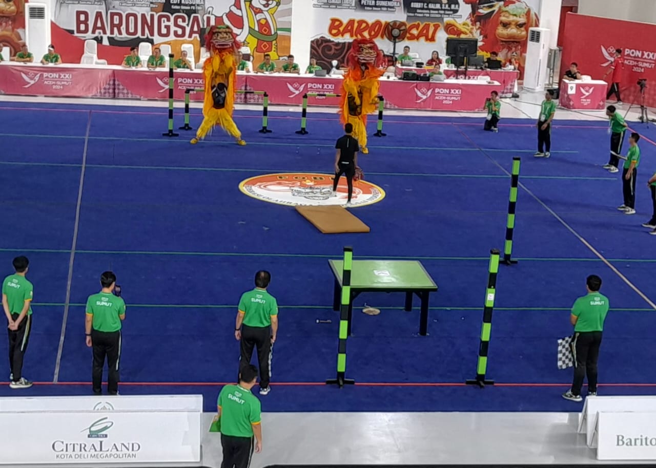 Dailyklik.id, DELISERDANG - Para atlet dari Provinsi Aceh memenangkan persaingan sengit cabang olahraga Barongsai nomor Pekingsai Kecepatan pada PON XXI di Gedung Martial Art Arena, Sport Center Sumut, Deliserdang, Sumatera Utara, Jumat (6/9). Pertandingan disudahi Aceh dengan perolehan waktu 37 detik.