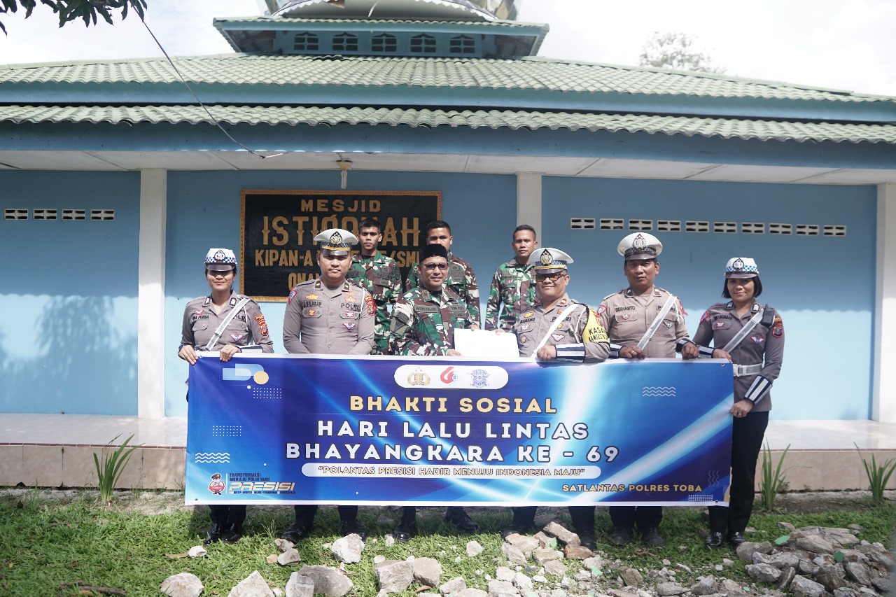DAILYKLIK.ID, Toba – Dalam rangka menyambut Hari Lalu Lintas Bhayangkara ke-69, Satuan Lalu Lintas (Satlantas) Polres Toba melaksanakan aksi sosial berupa penyerahan bahan bangunan dan dana untuk pembangunan Masjid Istiqomah di Kompi Senapan A Yonif 125/SMB, Balige, Kabupaten Toba, Selasa (10/9/2024).