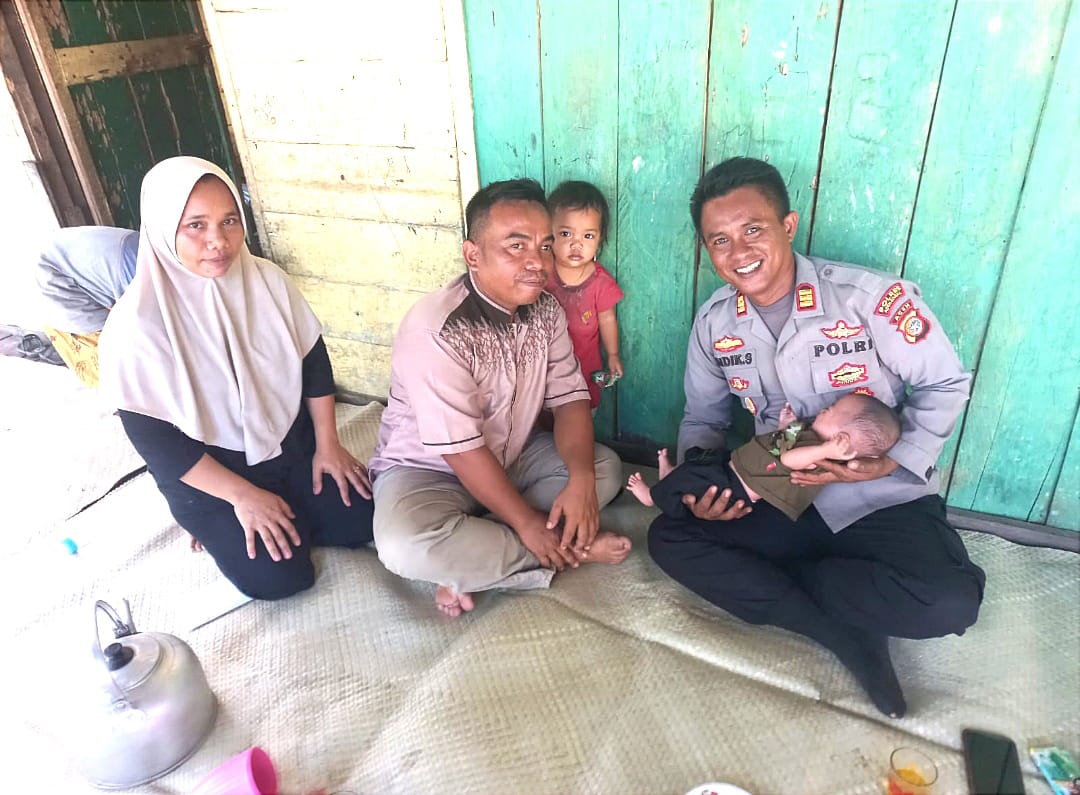 Kapolsek Singkil, AKP Didik Surya menggendong Fahmi, bayi usia 3 bulan yang terlahir dengan bibir sumbing. Kapolsek datang untuk menyerah bantuan dari Kapolres Aceh Singkil kepada Rahmat Wahyuni, orangtua Fahmi yang tinggal di Desa Suka Damai, Kecamatan Singkil, pada Kamis (2/1/2025).